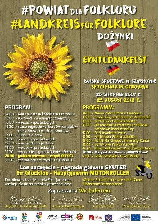 Organizują je wspólnie Starostwo Powiatowe, Urząd Miasta, Sołectwo Czarnowo, Centrum Artystyczno – Kulturalne Zamek oraz Ośrodek Sportu i Rekreacji, a wspiera Powiat Spree-Neisse – partner projektu. Tradycją jest już, że mieszkańcy miejscowości będących gospodarzami dożynek, każdego roku stawiają sobie poprzeczkę coraz wyżej i prześcigają się w liczbie atrakcji. Tak będzie również w Czarnowie, gdzie oprócz Mszy Świętej, korowodu, ceremoniału dożynkowego, turnieju sołectw, czy występów kapel ludowych, dla gości przygotowano również loterię, w której główną nagrodą jest skuter. Burmistrz Krosna Odrzańskiego, Marek Cebula podkreśla, że dożynki to największe i najważniejsze w roku święto, będące zwieńczeniem całorocznej, ciężkiej pracy rolników. – Ten tradycyjny bochen chleba to najwspanialszy symbol chłopskiej pracowitości, gospodarności oraz troski o lepsze jutro. Przepiękna polska tradycja nakazuje dzielić się chlebem. Ten gest jest wyrazem braterstwa, przyjaźni i chęci przyjścia z pomocą drugiemu człowiekowi. Pokazuje też na czym polega ludzka solidarność – dodaje włodarz. W podobnym tonie wypowiada się Starosta Krośnieński Mirosław Glaz, podkreślając, że święto plonów to czas odpoczynku po ciężkiej pracy, czas podziękowania za ten trud i wreszcie czas zabawy. – Serdecznie zapraszam wszystkich mieszkańców naszego powiatu oraz odwiedzających Powiat Krośnieński gości, aby wspólnie podzielić się chlebem i świętować w gronie najbliższych i przyjaciół. Program wydarzenia obfituje w ogrom atrakcji, a finałowa gwiazda wieczoru z pewnością porwie wszystkich do zabawy – dodaje. W trakcie święta plonów rozstrzygnięte zostaną konkursy na najpiękniejsze kosze i wieńce dożynkowe.